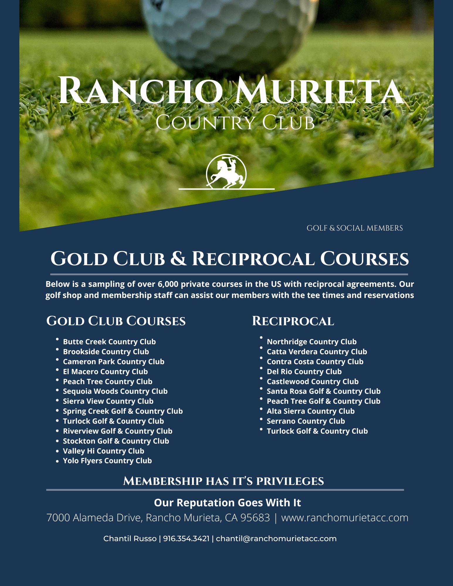 Ask any member and they will say that the best thing about Rancho Murieta Country Club is that it is truly a family. Lifelong friendships are made here. RMCC membership offers the unique opportunity to enjoy the benefits and privileges of a private country club set within our vibrant family oriented, rural community located at the gateway to the Sierra Foothills in Eastern Sacramento County. The Club offers two spectacular championship golf courses, a Spanish style clubhouse, versatile and scenic outdoor spaces, lighted tennis and pickleball courts, casual and fine dining and diverse and interesting activities and events.