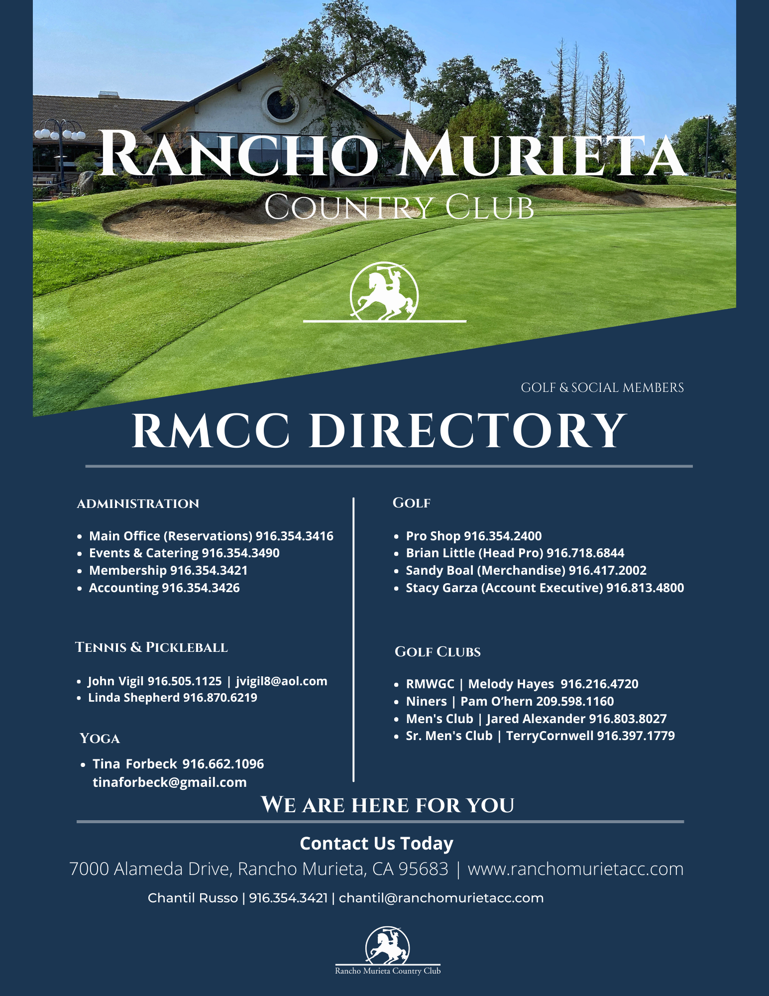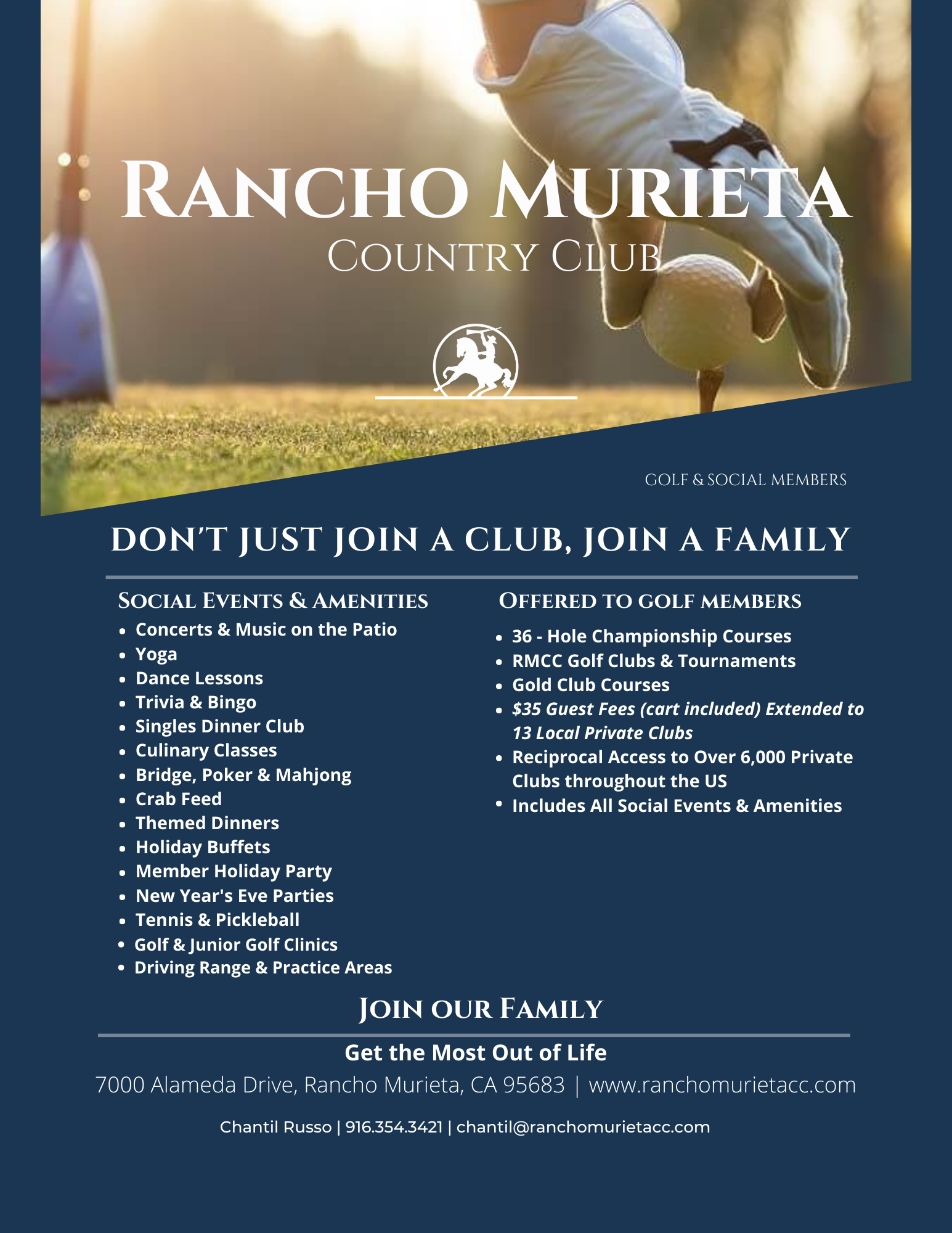 Ask any member and they will say that the best thing about Rancho Murieta Country Club is that it is truly a family. Lifelong friendships are made here. RMCC membership offers the unique opportunity to enjoy the benefits and privileges of a private country club set within our vibrant family oriented, rural community located at the gateway to the Sierra Foothills in Eastern Sacramento County. The Club offers two spectacular championship golf courses, a Spanish style clubhouse, versatile and scenic outdoor spaces, lighted tennis and pickleball courts, casual and fine dining and diverse and interesting activities and events.